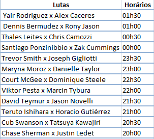O UFC Fight Night 92 começará às 20h00 pela hora oficial brasileira com seis batalhas preliminares sem qualquer atleta brasileiro. Já 23h00 teremos combates principais incluindo brasucas Thales Leites e Rony Jason encarando respectivamente Chris Camozzi e Dennis Bermudez.