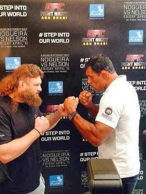 Rodrigo Minotauro e Roy Nelson tiraram fotos nos Emirados Árabes e, claro, não poderiam deixar de dar a primeira encarada no confronto.