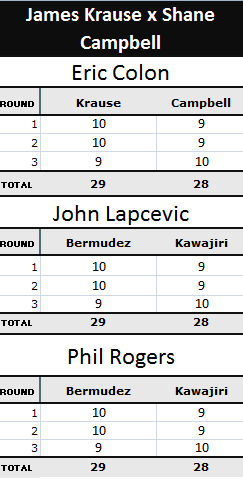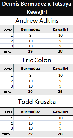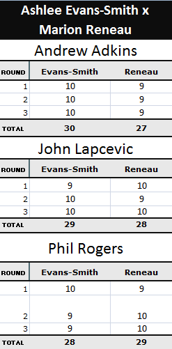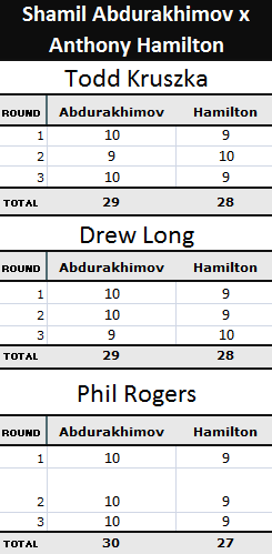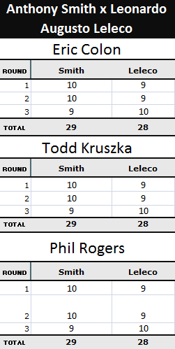 O único brasileiro que teve sua luta decidida desta forma foi o estreante Leonardo Augusto Leleco, e ele acabou levando a pior frente a Anthony Smith por triplo 29-28 em todos os três rounds.