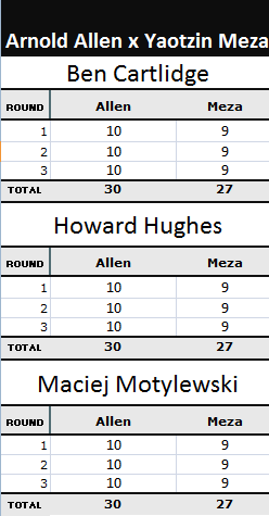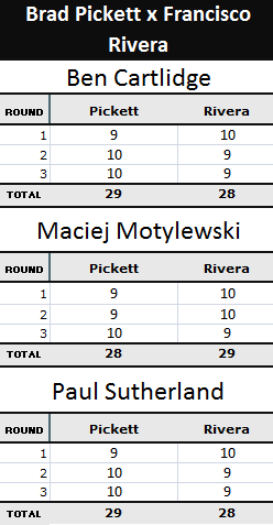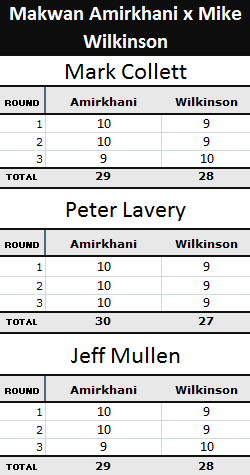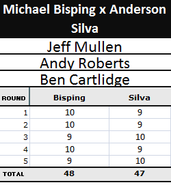 O resultado mais debatiido acabou sendo entre Anderson Silva e Michael Bisping. Nele, Ben Cartlidge, Jeff Mullen e Andy Roberts que arbitraram marcaram os mesmos pontos elegendo elegeram o inglês com o grande vencedor.