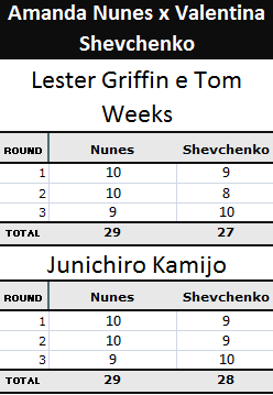 Dentre esses combates, um deles acabou sendo a lutadora brasileira Amanda Nunes, onde na visão destes juízes Lester Griffin, Tom Weeks e Junichiro Kamijo venceu a atleta peruana Valentina Schevchenko pela unanimidade.