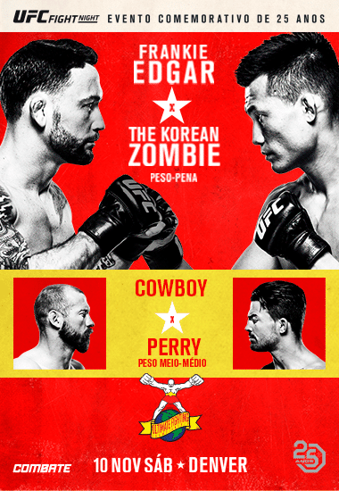 10 de Novembro de 2018 RESUMOO poster do UFC Denver apresenta como maior destaque os lutadores da divisão peso-pena Frankie Edgar e "The Korean Zombie". Logo abaixo deles estão também Cowboy e Perry.