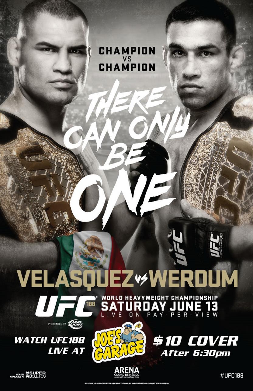 13 de Junho de 2015 RESUMOO poster do UFC 188 tem na imagem principal do lado esquerdo o lutador americano Cain Velasquez, segurando a bandeira do México, local onde o combate será realizado e, a direita, encontra-se o brasileiro Fabricio Werdum. Entre eles, está escrito "Campeão só pode haver um", uma alusão ao fato deles estarem disputando a unificação do cinturão da categoria mais pesada do MMA.